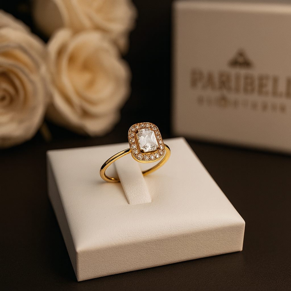 Magnifique bague dorée en acier inoxydable, ornée d’un zircon central taille rectangle entouré de strass étincelants. Taille ajustable : s’adapte parfaitement à votre doigt. Ne rouille pas dans l’eau, idéale pour un usage quotidien. Expédition en moyenne sous 24 heures.