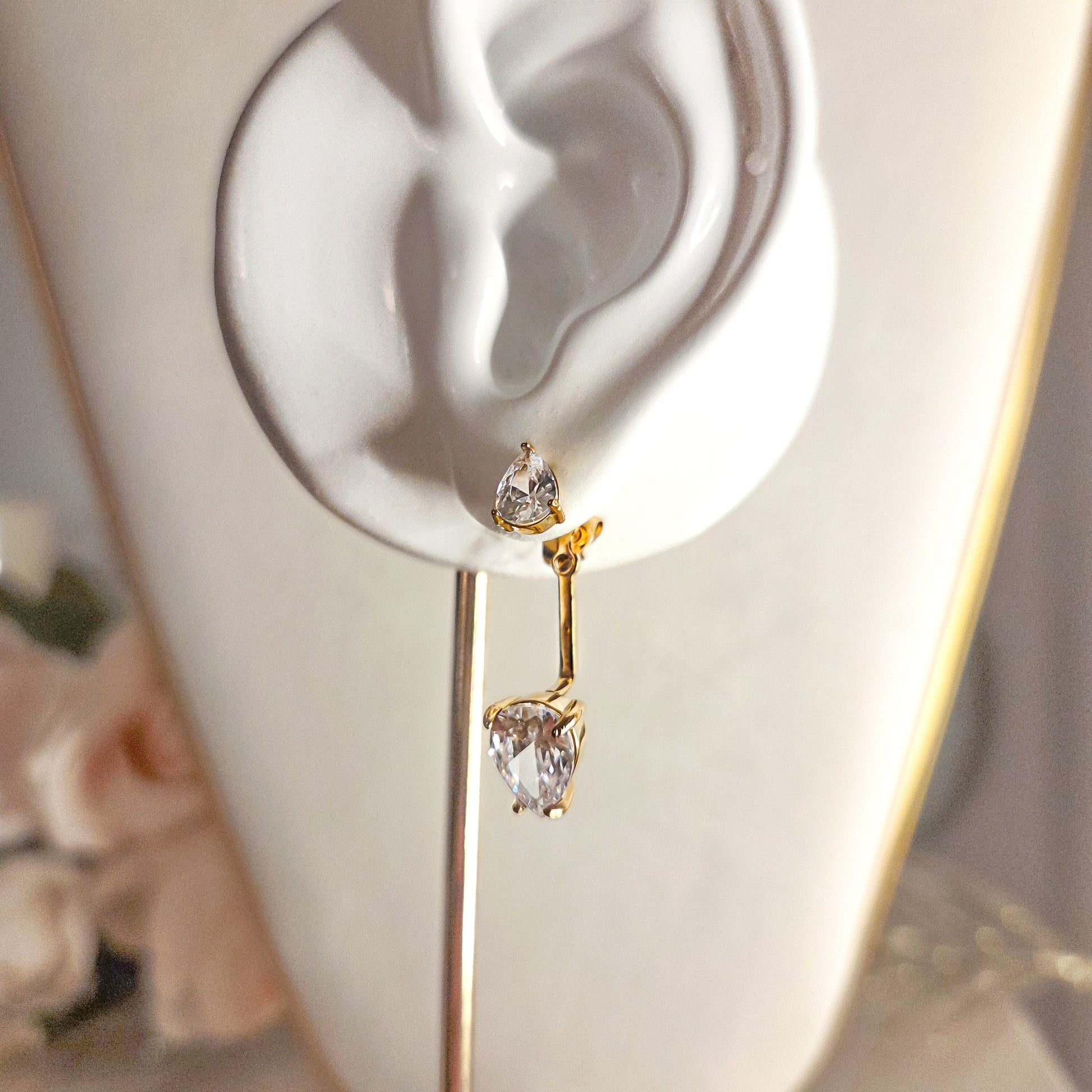 Ces boucles d’oreilles pendantes apportent une touche élégante et lumineuse grâce à leur design en double pierre goutte.